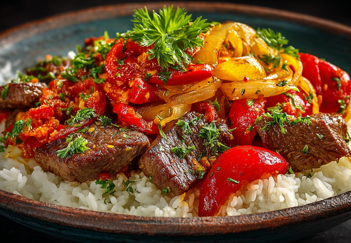 Для блюда: 2 стейка говяжьего антрекота (примерно 400–500 г), 2 столовые ложки растительного масла, луковица, зеленый болгарский перец, красный болгарский перец, 2 помидора, чайная ложка соли, 0,5 чайной ложки сахара, чайная ложка черного перца, чайная ложка острой паприки. Для гарнира: столовая ложка сливочного масла, стакан риса (желательно пропаренного или басмати), 2 стакана воды, 0,5 чайной ложки соли.