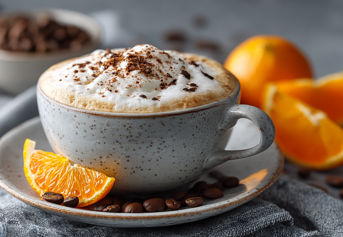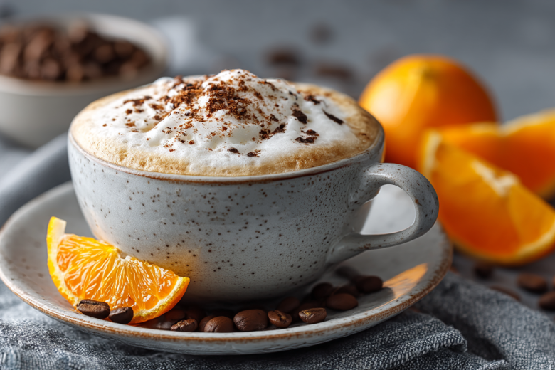 Апельсин тщательно мою, снимаю цедру (только оранжевую часть, без белой горечи). В ступке растираю цедру с тростниковым сахаром до появления сока и насыщенного аромата. Варю эспрессо (100 мл) и горячим вливаю в ступку с растертой цедрой и сахаром. Тщательно перемешиваю и взбиваю капучинатором до однородности, чтобы сахар полностью растворился, а кофе насытился цитрусовым ароматом. Отдельно подогреваю сливки (или молоко) до горячего состояния, но не кипячу. Взбиваю их капучинатором до образования плотной, пышной пенки толщиной 1,5–2 см. В чашку аккуратно вливаю кофейно-апельсиновую смесь. Сверху ложкой выкладываю взбитую пенку, стараясь сохранить ее воздушность. Украшаю щепоткой корицы или свежей апельсиновой цедрой. Подаю сразу, пока напиток горячий и ароматный.