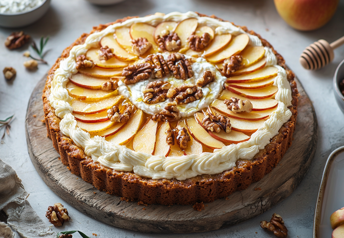 2. Остудите пирог. Сделайте крем из творога и меда, смажьте пирог. Посыпьте его измельченными орехами.