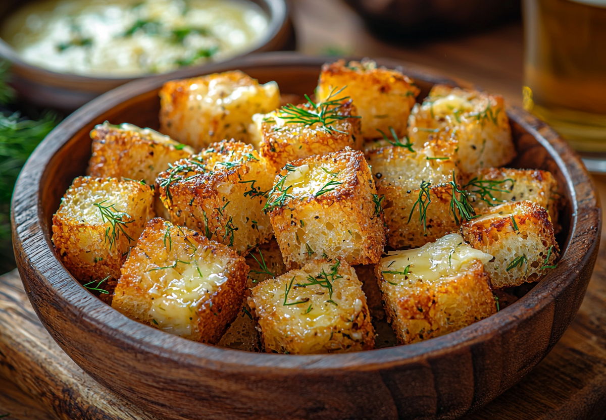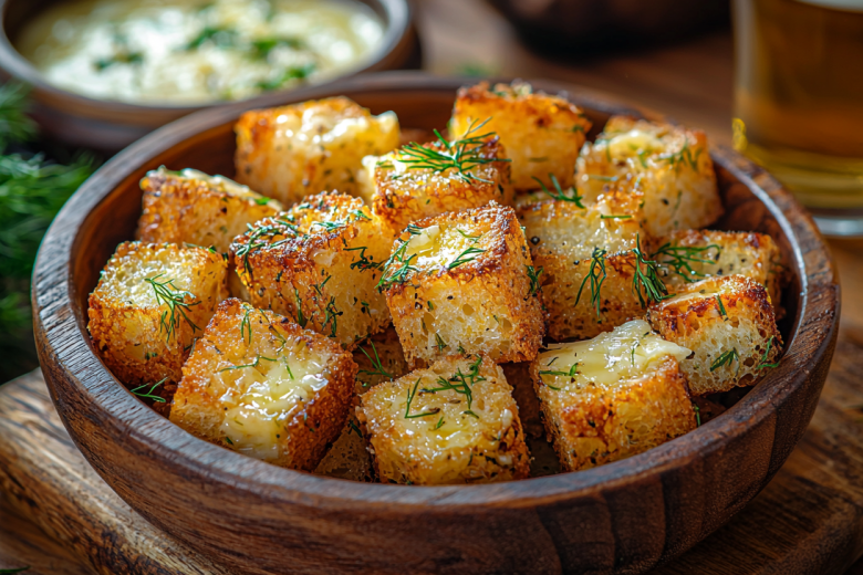 - Хлеб нарежьте кубиками 2×2 см. В пакете смешайте растопленное сливочное масло, измельченный чеснок, мелко натертый сыр, рубленый укроп и соль. Добавьте хлебные кубики, закройте пакет и тщательно потрясите для равномерного распределения соуса.