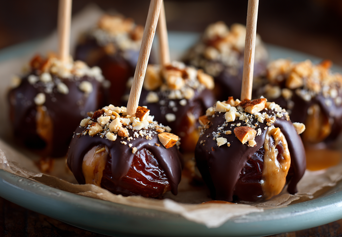 Шаг 1. Сделайте надрезы на финиках и удалите косточки. Начините их арахисовой пастой.