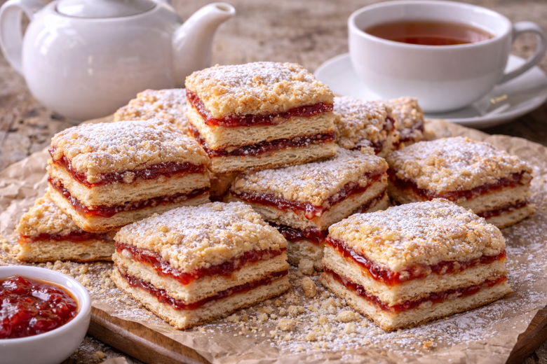 Ингредиенты (на 24 штуки): для теста — сливочное масло 250 г, мука 600 г, соль 1/2 ч. л., разрыхлитель 1 ч. л., кефир 300 мл; для штрейзеля — мука 150 г, сахар 150 г, сливочное масло 140 г; дополнительно — густое варенье или джем 200–250 г, сахарная пудра для подачи.
