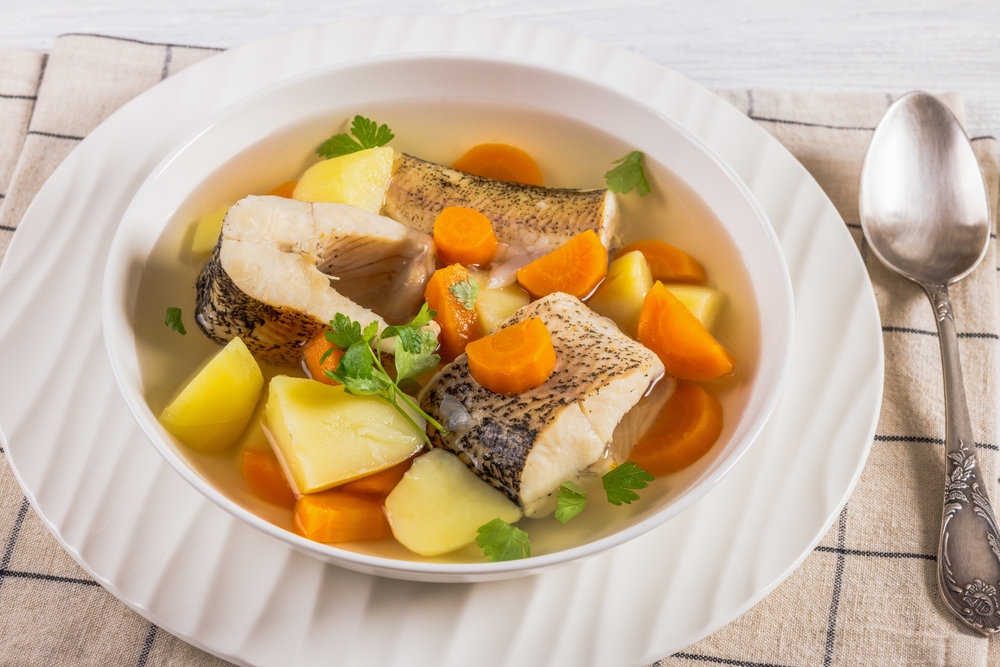 Рыбу разрезать на куски со стороной примерно 4 см, заложить в кипящую воду. В течение четверти часа, пока щука варится, снимайте пену с бульона. Параллельно нарежьте картошку толстой соломкой, лук мелко покрошите, морковь натрите на крупной терке.