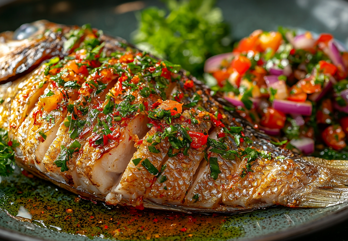 Этот рецепт объединяет нежную средиземноморскую дорадо с яркими азиатскими акцентами. Паста том-ям и сливочное масло создают невероятный ароматный соус, а острый салат с сумахом и чили идеально оттеняет вкус рыбы.