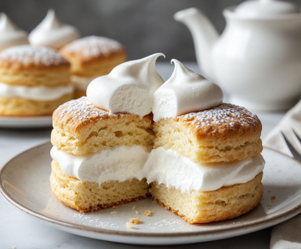 Для приготовления вам понадобится: для теста — 200 г творога, 100 г сливочного масла, 1 яйцо, 200 г муки, 50 г сахара, 1 ч. л. разрыхлителя, ванилин, щепотка соли; для начинки — 1 яичный белок, 50 г сахарной пудры. Творог разомните с мягким маслом, добавьте яйцо, сахар, соль и ванилин. Всыпьте муку с разрыхлителем, замесите мягкое тесто. Разделите на 8 частей, раскатайте лепёшки. Для начинки взбейте белок с сахарной пудрой до устойчивых пиков. На каждую лепёшку выложите немного безе, защипните края, формируя булочки. Выпекайте при 190 градусах 15–20 минут до румяной корочки.