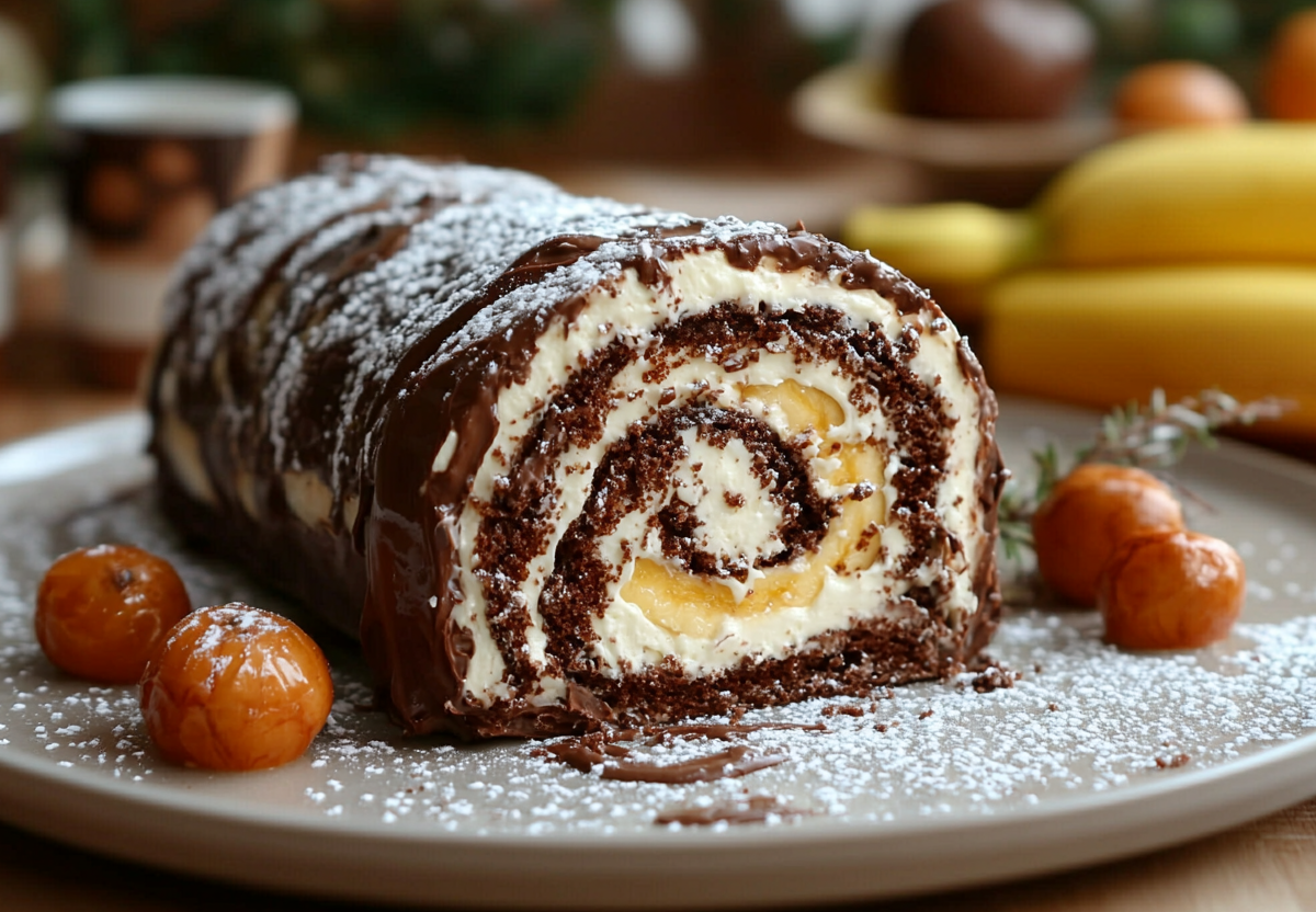 Рецепт: для коржа измельчите 200 г шоколадного печенья в крошку и смешайте с одним спелым размятым бананом до однородной пластичной массы. Выложите смесь на пленку, раскатайте в пласт. Для крема взбейте 200 г сливочного сыра с 3 ст. л. сахарной пудры и 100 мл сливок 33%. Равномерно распределите крем по коржу, аккуратно сверните рулет с помощью пленки и уберите в холодильник на 4 часа.