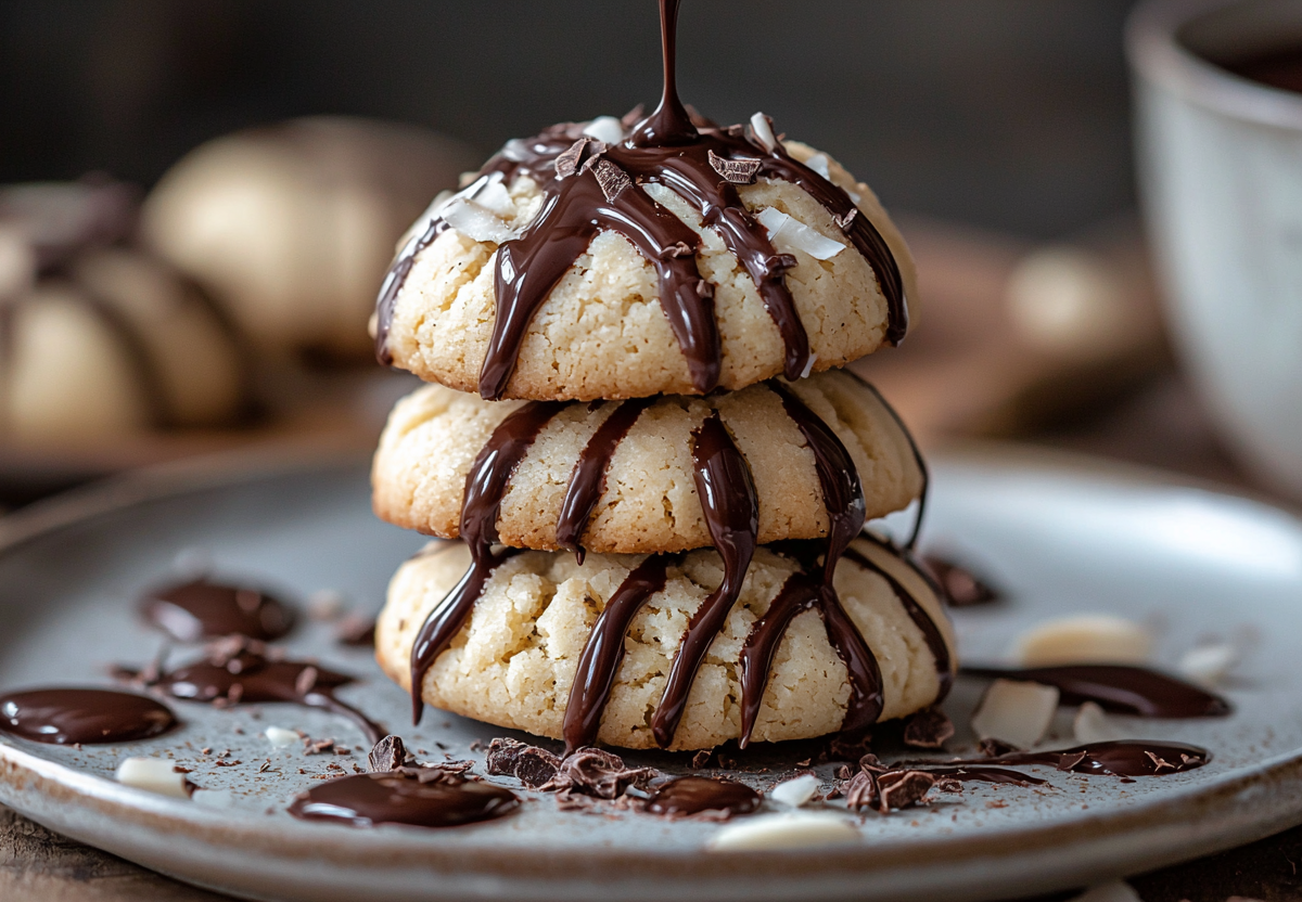 Готовлю я так: два спелых банана разминаю вилкой до состояния пюре и смешиваю с 180 граммами кокосовой стружки. Даю массе постоять 5–7 минут — стружка впитает влагу и смесь станет более плотной. Формирую небольшие печенья, выкладываю на противень с пергаментом и выпекаю при 180°C 10–12 минут до легкого румянца. Пока печенье остывает, растапливаю на водяной бане белый и молочный шоколад (примерно 25 граммов на каждое печенье) и поливаю им готовые изделия. Шоколад быстро застывает, создавая хрустящую глазурь.