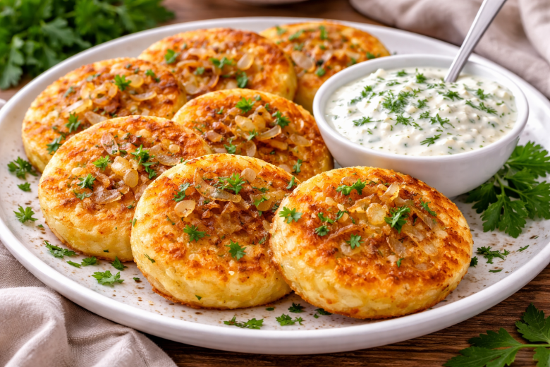 Картофель очистите, нарежьте и отварите до мягкости, затем разомните в пюре. Добавьте соль, перец и крахмал, тщательно перемешайте до плотной массы. Лук нарежьте мелко и обжарьте до золотистого цвета — он добавит сладость и насыщенный вкус. Вмешайте жареный лук, сформируйте из картофельной массы небольшие лепешки. Обжарьте лепешки на разогретом масле с двух сторон до румяной корочки. Для соуса смешайте мягкий сырок со сметаной, добавьте измельченный чеснок и зелень.