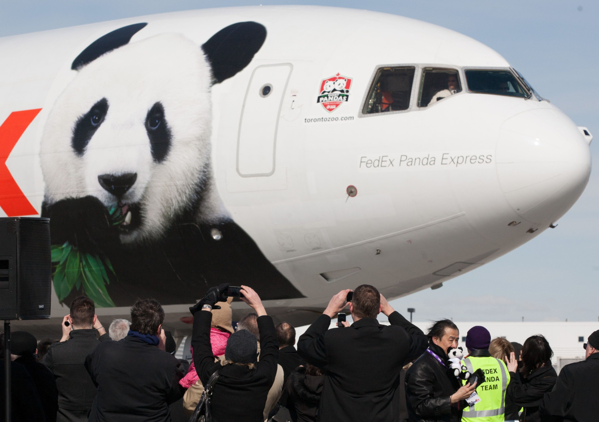 Гигантские панды Жуи и Диндин прилетели в Москву на Boeing 777F грузовой почтовой авиакомпании FedEx, у которой есть специальное подразделение Panda Express. В полёте их сопровождал ветеринар.