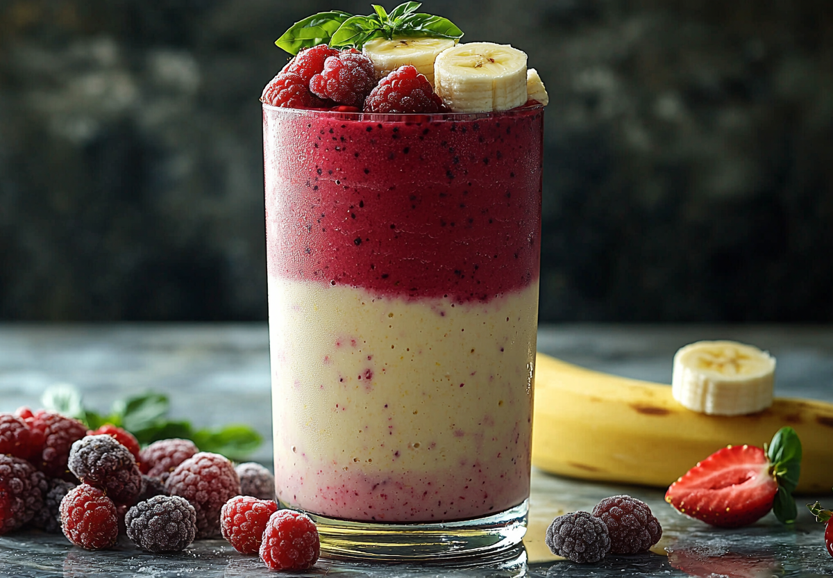 Двухслойный напиток-десерт! Домашняя вкусняшка из сливок, сока и ягод! Этот яркий двухслойный смузи сочетает нежность бананового крема с насыщенным ягодным вкусом. Идеальный вариант для полезного перекуса или освежающего десерта. Два контрастных слоя создают не только эффектный вид, но и интересное сочетание вкусов.