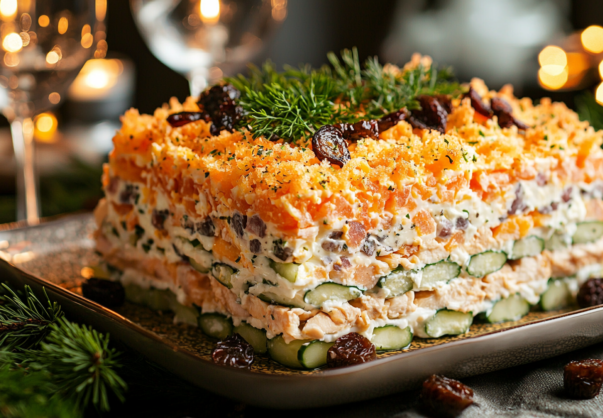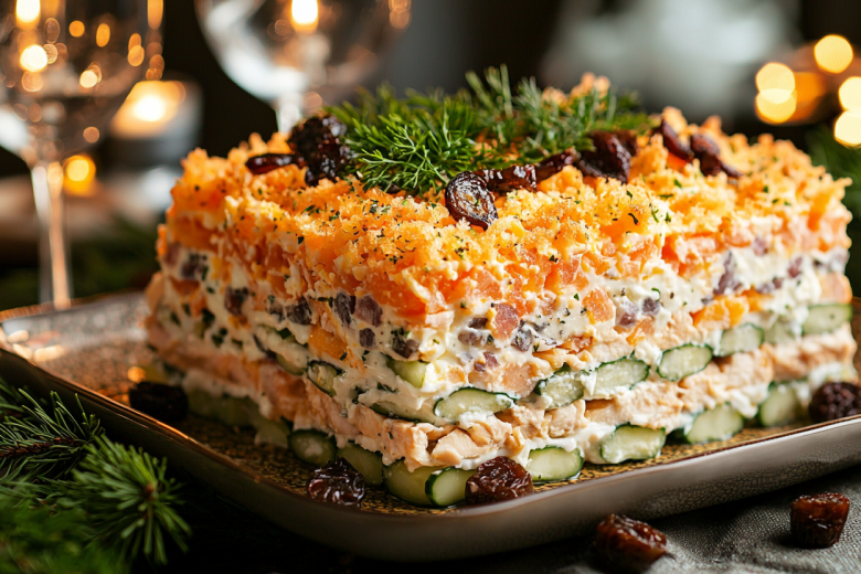 Вкус получается многогранным и очень гармоничным: сладковатая морковь, свежий огурец, солоноватая ветчина, нежные белки, пикантный сладкий чернослив и сливочный сыр создают настоящую симфонию вкусов. Это блюдо точно запомнится вашим гостям.