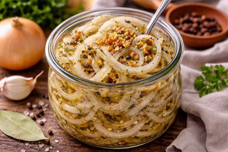 Лук нарезаем кольцами или полукольцами и перекладываем в глубокую миску. Добавляем сухую зелень, лавровый лист, сахар, перец и соль. Вливаем уксус и хорошо перемешиваем, чтобы специи равномерно распределились. Отдельно разогреваем растительное масло и обжариваем в нём чеснок до золотистого цвета. Как только чеснок станет румяным и ароматным, заливаем лук кипящим маслом — именно этот шаг мгновенно убирает горечь и делает вкус особенно мягким. Всё ещё раз тщательно перемешиваем. Готовый лук перекладываем в банку и убираем в холодильник. Он хорош уже через 15–20 минут, но на следующий день становится ещё вкуснее.