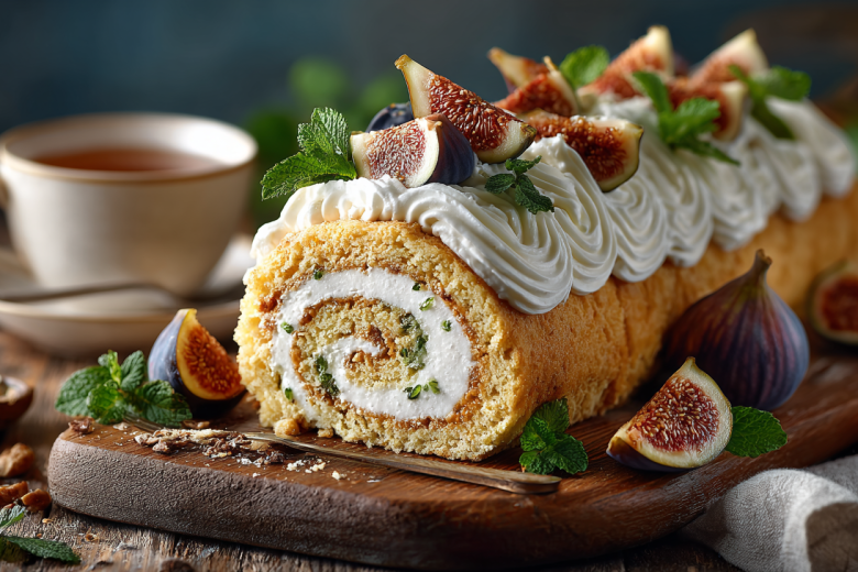 Выливаю его на противень с пергаментом и выпекаю 12–15 минут при 200 градусах, затем полностью остужаю. Для крема взбиваю мягкое сливочное масло — 200 г с сахарной пудрой — 100 г до пышности. Отдельно смешиваю сливочный творожный сыр — 450 г и вареную сгущенку — 100 г, соединяю обе массы. Инжир свежий — 8 шт. нарезаю дольками. На корж наношу большую часть крема, выкладываю инжир и аккуратно сворачиваю рулетом. Сверху смазываю оставшимся кремом, украшаю инжиром и мятой. Перед подачей охлаждаю 1–2 часа.