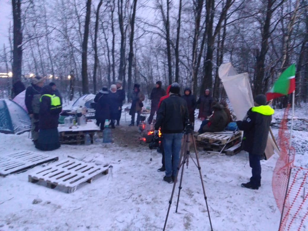 После того как активисты заблокировали работу техники, строительство начали вести по ночам. В результате было решено разбить круглосуточный палаточный лагерь. Сейчас в нём около 10 человек. Они продолжают блокировать технику.