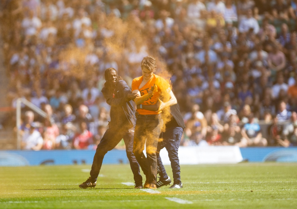 Двое активистов движения Just Stop Oil выбежали на поле в середине первой половины матча между регби-командами в Лондоне и разбросали по полю оранжевую краску, передает The Guardian. Экоправозащитников вывели с поля охранники спортивного мероприятия. Матч пришлось временно прервать. Само движение распространило в СМИ заявление по поводу проведенной акции.
