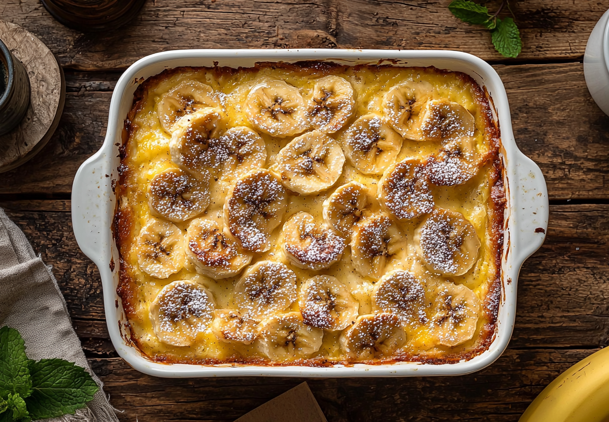 - Выложить бананы в форму и залить творожной массой. Выпекать в разогретой до 180 °C духовке 20–30 минут до легкой румяности.