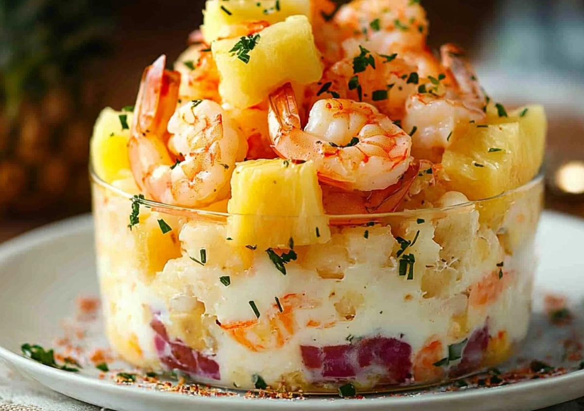 Праздничный стол — отличный повод порадовать себя и близких. В этом году предлагаем приготовить новогодний салат с креветками и ананасами. Главная прелесть блюда — вы не потратите на него много времени в предпраздничных хлопотах. Попробуйте!