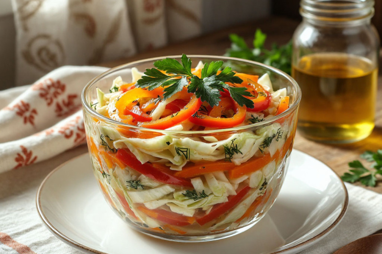 Для приготовления вам понадобится: 1 кг белокочанной капусты, 300 г моркови, 200 г репчатого лука, 200 г болгарского перца, 3 ст. ложки томатной пасты, 2 ст. ложки сахара, 1 ст. ложка соли, 2 ст. ложки 9% уксуса, 100 мл растительного масла, 150 мл воды, пучок укропа и петрушки. Капусту тонко нашинкуйте, морковь натрите на крупной тёрке, лук и перец нарежьте тонкой соломкой. В кастрюле смешайте масло, воду, сахар, соль и томатную пасту, доведите до кипения. Закиньте все овощи, перемешайте и тушите под крышкой 15–20 минут на среднем огне. Влейте уксус, добавьте рубленую зелень, прогрейте 2–3 минуты. Горячим разложите по банкам или подавайте к столу после остывания.