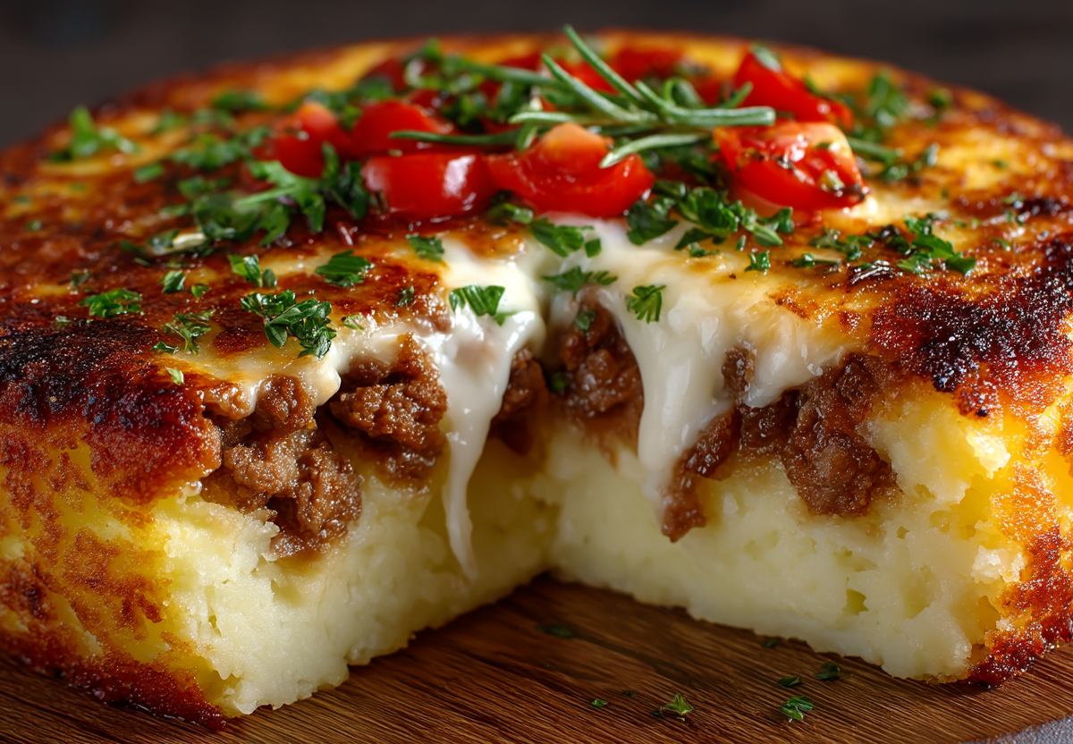 Рецепт: картофель отварите до готовности в подсоленной воде. На сковороде обжарьте мелко нарезанный лук до прозрачности, добавьте фарш и жарьте, разбивая комочки, до изменения цвета. Затем добавьте нарезанные кубиками помидоры, тушите 5–7 минут, посолите, поперчите. Картофель разомните в пюре с кусочком сливочного масла. Смажьте форму для запекания маслом. Выложите картофельное пюре, распределяя его по дну и формируя бортики. Затем выложите мясную начинку. Сверху щедро посыпьте тертым сыром. Запекайте в разогретой до 200 °C духовке 15–20 минут до расплавления и зарумянивания сыра. Дайте пирогу немного остыть в форме перед подачей, затем нарезайте на порции.