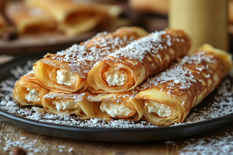 Вкус этого десерта невероятно гармоничный: нежные тонкие блины с хрустящими краями идеально сочетаются с кремовой творожной массой, где кокосовая стружка создает тропическую нотку, а вареная сгущенка дарит насыщенную карамельную сладость. Подавайте блинчики слегка подогретыми.