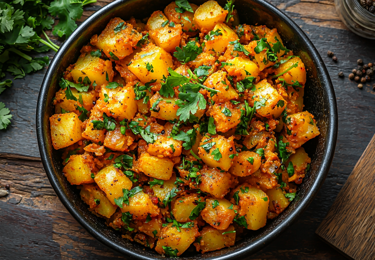 Это индийское блюдо стало для меня настоящим открытием — картофель в пикантном карри с неожиданными сладкими нотами ананаса создает удивительную гармонию вкусов. Ароматная асафетида и свежая кинза делают блюдо по-настоящему аутентичным. Такой ужин готовится быстро, но запоминается надолго.