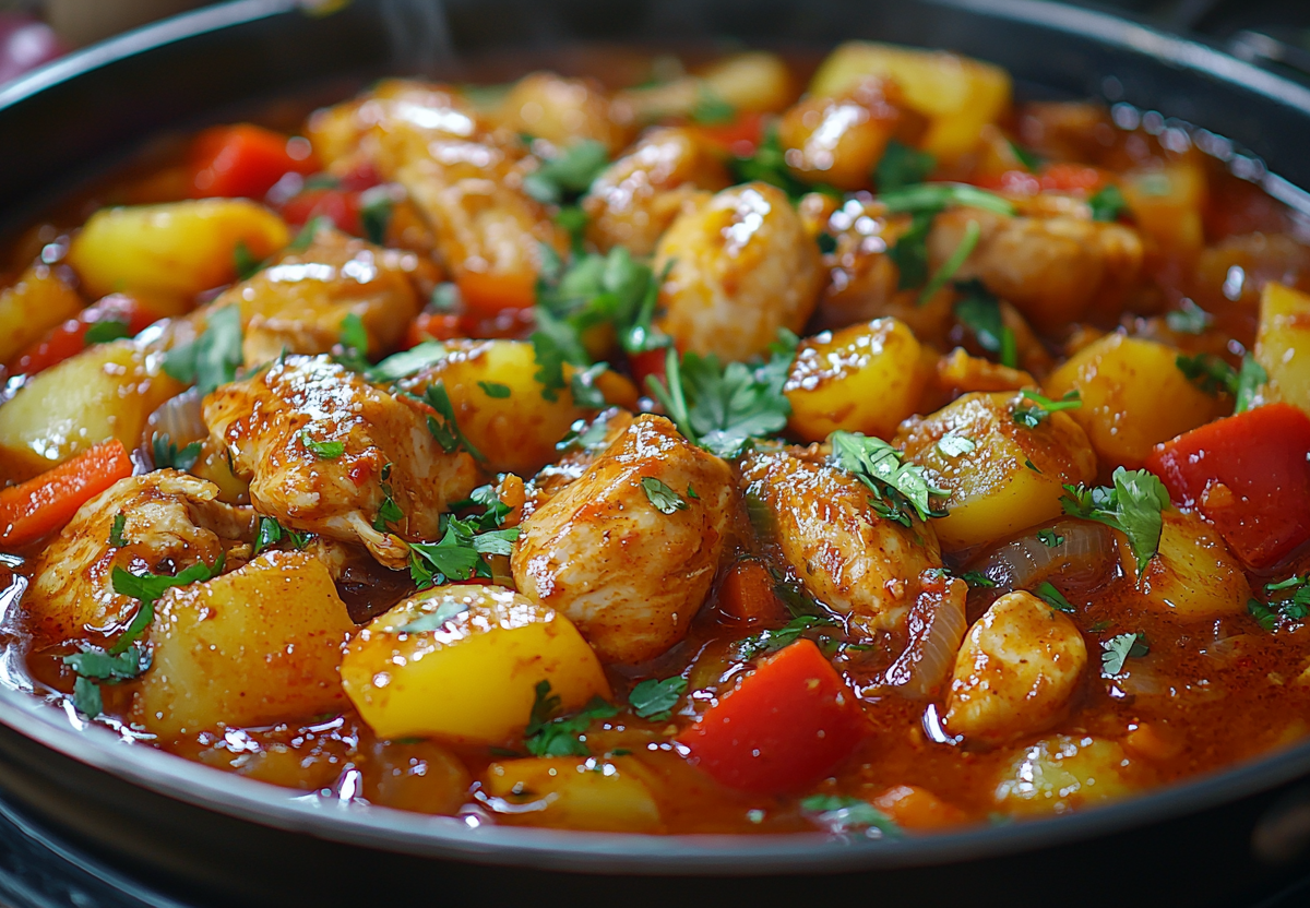 Вам понадобится: 1 кг курицы, 3 картофелины, 2 моркови, 2 луковицы, 3 зубчика чеснока, 2 болгарских перца, 2 ст. л. томатной пасты, 1 ч. л. зиры, 1/2 ч. л. паприки, соль, перец, растительное масло. Курицу нарежьте порционными кусками, обжарьте до золотистой корочки. Добавьте нарезанный лук и морковь, готовьте 5 минут. Положите томатную пасту, специи, перемешайте. Добавьте нарезанный картофель и болгарский перец, влейте стакан воды. Тушите под крышкой 25–30 минут до готовности картофеля. В конце добавьте измельченный чеснок. Подавайте с рисом или лапшой, посыпав свежей зеленью.