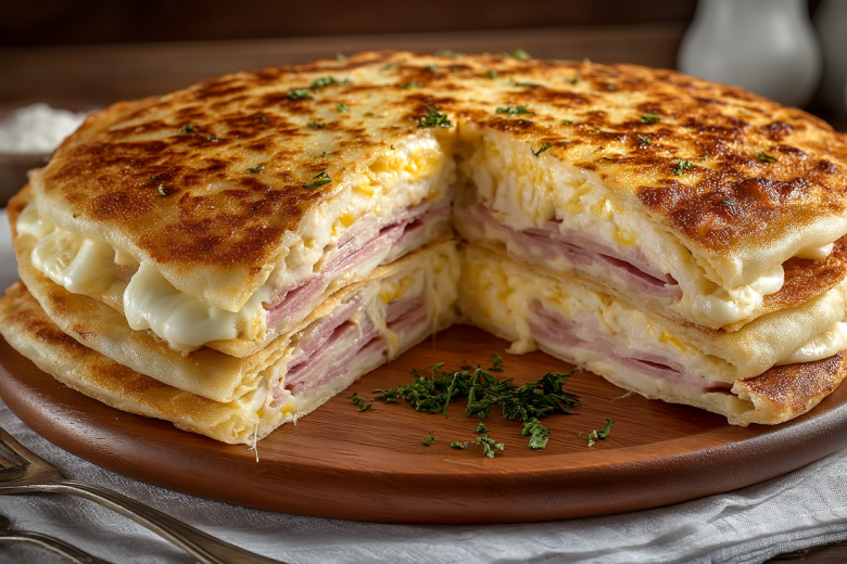 Накройте вторым лавашом, повторите слои. Накройте третьим лавашом. Закройте крышкой и жарьте на среднем огне 5–7 минут. С помощью тарелки переверните пирог. Влейте под него второе взбитое яйцо, приподнимая край. Жарьте еще 5–7 минут до румяной корочки.
