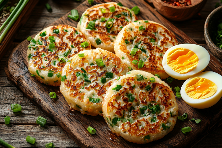 Вам понадобится: 3-4 отварных яйца, большой пучок зеленого лука (примерно 100 г), 250 мл кефира, 2,5 стакана муки, 1 ч. л. соды, соль и перец по вкусу. Яйца натрите на крупной терке, зеленый лук мелко нарежьте. Смешайте все ингредиенты до консистенции густой сметаны — тесто должно медленно сползать с ложки. Столовой ложкой выкладывайте массу на хорошо разогретую сковороду с растительным маслом и жарьте под крышкой на среднем огне по 3-4 минуты с каждой стороны до золотистой корочки.