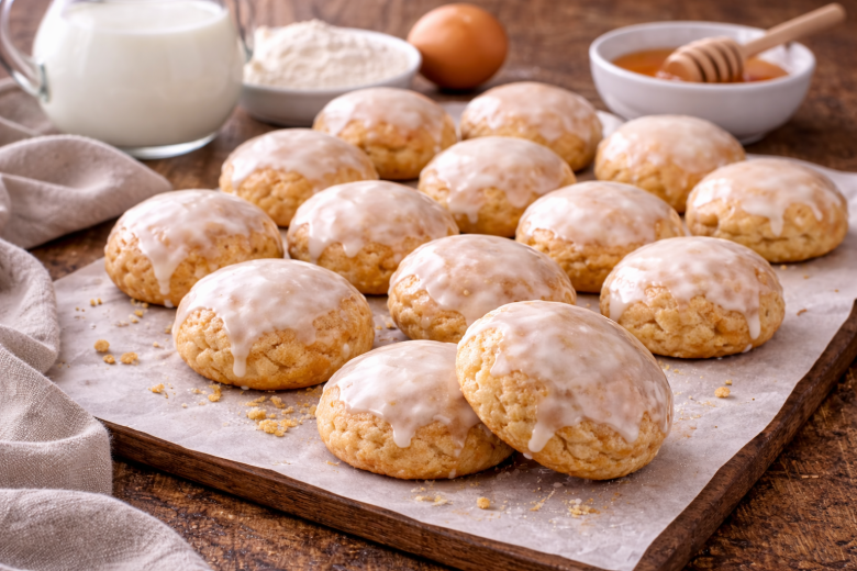 Желтки и один белок взбивают с сахаром и мёдом, добавляют кефир и масло, снова перемешивают. Постепенно всыпают муку с содой и замешивают мягкое тесто. Его раскатывают слоем около 1 см, вырезают кружочки и выкладывают на противень с пергаментом. Выпекают при 180–190 °C около 25 минут. Пока пряники пекутся, белок взбивают с сахаром до растворения крупинок. Готовую выпечку быстро смазывают помадкой и возвращают в духовку ещё на 8–10 минут. После остывания пряники становятся особенно нежными и вкусными — настоящая домашняя классика к чаю.