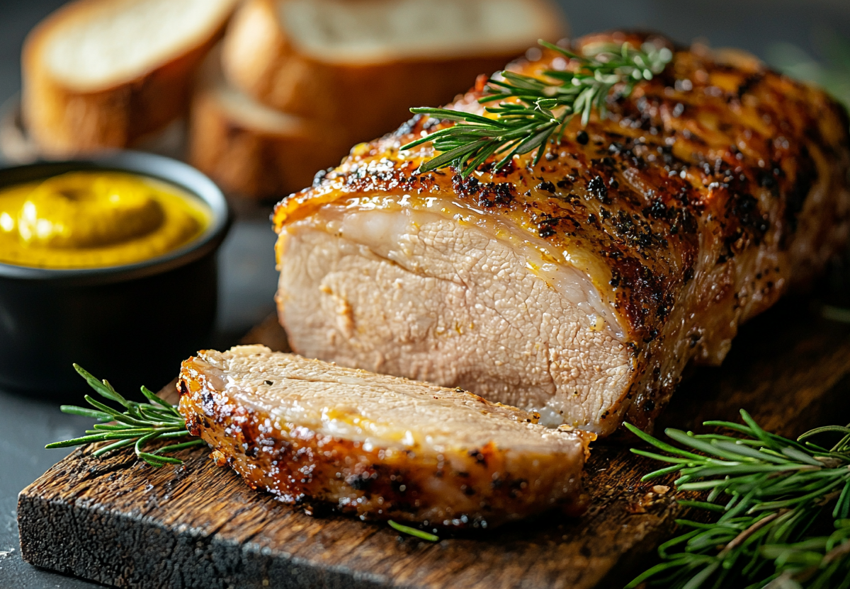 Достаю мясо из холодильника за час до готовки. Запекаю в разогретой до 200 °C духовке 30 минут без крышки. Затем уменьшаю температуру до 180 °C, накрываю мясо листом пергамента и запекаю еще 45 минут. Даю буженине остыть в выключенной духовке, затем нарезаю тонкими ломтиками и подаю с черным хлебом и горчицей.