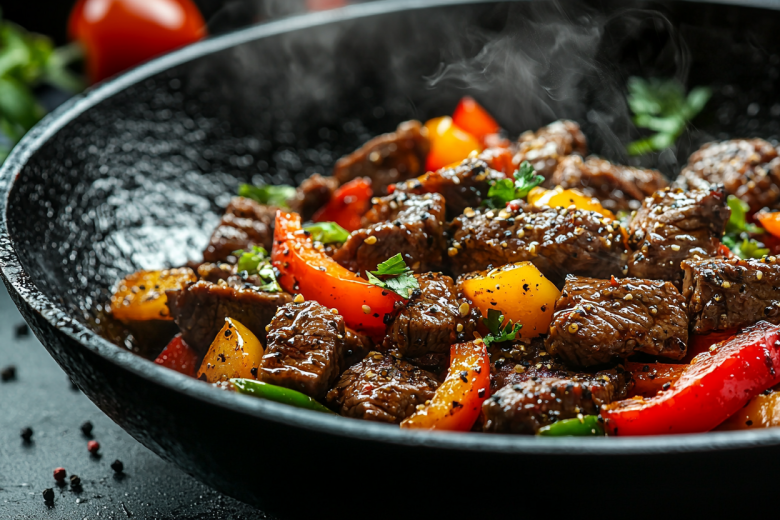 Говядину (300 г, вырезка, тонкий край) нарезаю тонкими ломтиками поперек волокон. Готовлю маринад: смешиваю соевый соус (2 ст. л.), кукурузный крахмал (1 ст. л.), приправу для говядины (1 ч. л.), молотый черный перец (1,5 ч. л.), пищевую соду (⅓ ч. л.), измельченный чеснок (2 зубчика) и растительное масло (1 ст. л.). Заливаю мясо маринадом, хорошо перемешиваю и оставляю минимум на 20 минут. Готовлю соус: в миске смешиваю соевый соус (2 ст. л.), устричный соус (1 ст. л.), винный уксус (1 ст. л.), черный перец (1 ч. л.), кукурузный крахмал (1 ст. л.) и воду (100 мл). Размешиваю до растворения крахмала. Лук (1 шт.) и болгарский перец (половинки красного и зеленого) нарезаю крупными кусками. Раскаляю сковороду вок или обычную с толстым дном с большим количеством масла. Выкладываю мясо порциями, чтобы оно не тушилось, а быстро обжаривалось. Обжариваю каждую порцию по 1–2 минуты до корочки, выкладываю в миску. В оставшемся масле на сильном огне обжариваю лук и перец 2–3 минуты, чтобы они остались хрустящими. Возвращаю мясо в сковороду. Перемешиваю. Вливаю приготовленный соус, интенсивно перемешиваю. Соус загустеет за 30–40 секунд. Сразу снимаю с огня. Подаю горячим с рисом.