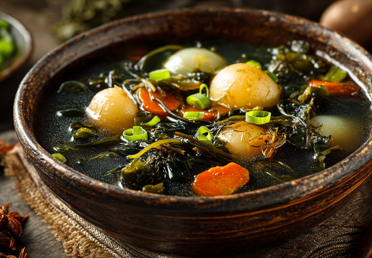 Этот суп — виртуозный кулинарный фокус. Глаза видят простой овощной бульон с картошкой. Но как только вы подносите ложку ко рту, нос улавливает легкий, но отчетливый запах моря, йода, водорослей — тот самый, что идет от настоящей ухи. Это морская капуста совершает чудо преображения, насыщая бульон своим уникальным «морским» духом без единого кусочка рыбы.