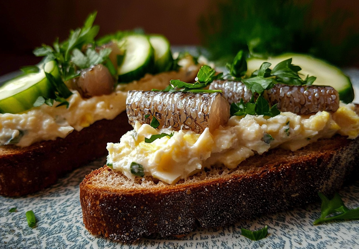Приготовление: хлеб слегка подсушите в тостере или на сухой сковороде до лёгкой хрустящей корочки. Для намазки натрите на мелкой тёрке варёное яйцо и свежий огурец (можно отжать от лишнего сока). Мелко порубите зелень и лук. Соедините яйцо, огурец, зелень и лук, заправьте майонезом до желаемой консистенции и перемешайте. Филе сельди нарежьте на небольшие кусочки. На каждый ломтик хлеба нанесите слой яично-огуречной намазки, сверху выложите кусочек сельди. При желании украсьте веточкой укропа. Подавайте сразу.