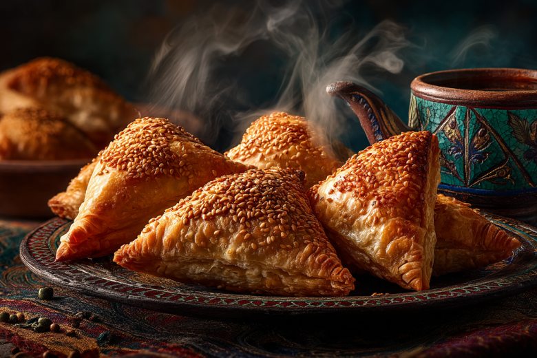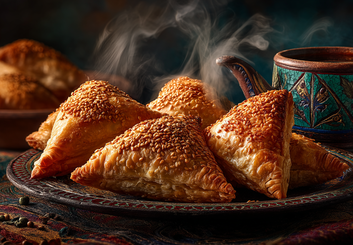 Для теста (или готовое слоеное): мука пшеничная (500 г), вода ледяная (250 мл), жир бараний или курдючный (100 г), соль (1 ч. л.). Для начинки: баранина или говядина с жирком (500 г), курдючный жир (100 г), репчатый лук (3–4 крупные головки), зира свежемолотая (1 ч. л.), кориандр молотый (0,5 ч. л.), черный перец свежемолотый, соль по вкусу. Для смазки: яйцо (1 шт.), кунжут для посыпки.