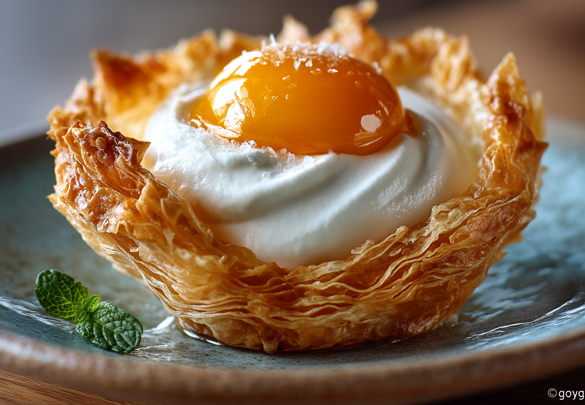 С первого взгляда кажется, что на тарелке аккуратная глазунья. Но стоит взять ложку — и вас ждет фейерверк текстур: тончайшее хрустящее тесто, бархатистый кокосовый крем и сочная сладость запеченного персика. Этот десерт — мастер-класс по тому, как простые ингредиенты могут создать абсолютно праздничное и запоминающееся блюдо, идеальное не только для постного меню.