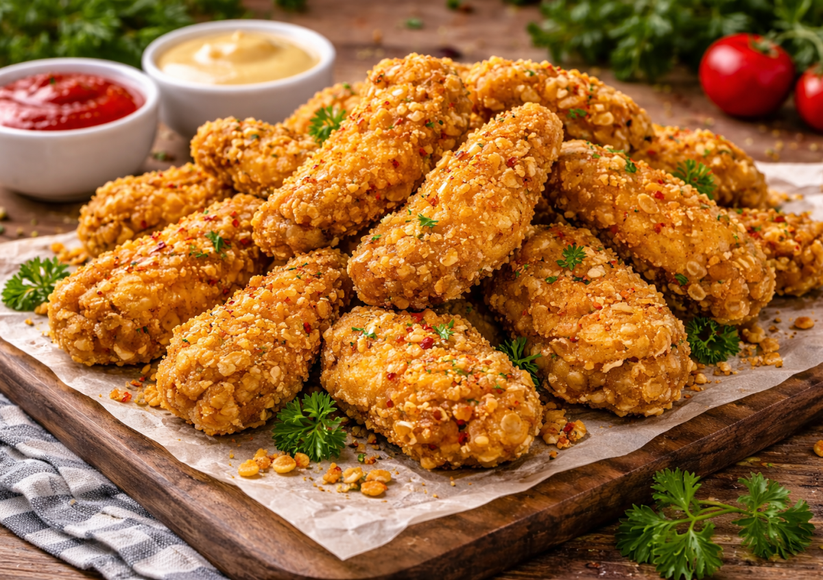 Ингредиенты: куриные крылышки — 10–12 шт., растительное масло — для жарки, кукурузные хлопья без сахара — 150–200 г, мука — 3–4 ст. л., яйца — 2 шт., соль — по вкусу, паприка сладкая — 1 ч. л., паприка копченая — 0,5 ч. л., черный молотый перец — 0,5 ч. л., острый перец — по желанию, чеснок сушеный или свежий — 1 ч. л.