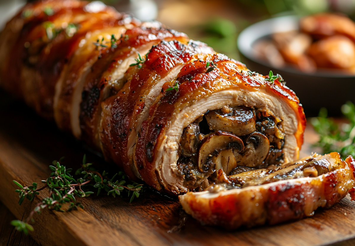 Этот рулет сочетает в себе хрустящий бекон снаружи и нежнейшую куриную начинку с грибами и сыром внутри. Идеальное блюдо для праздничного стола или особого ужина.