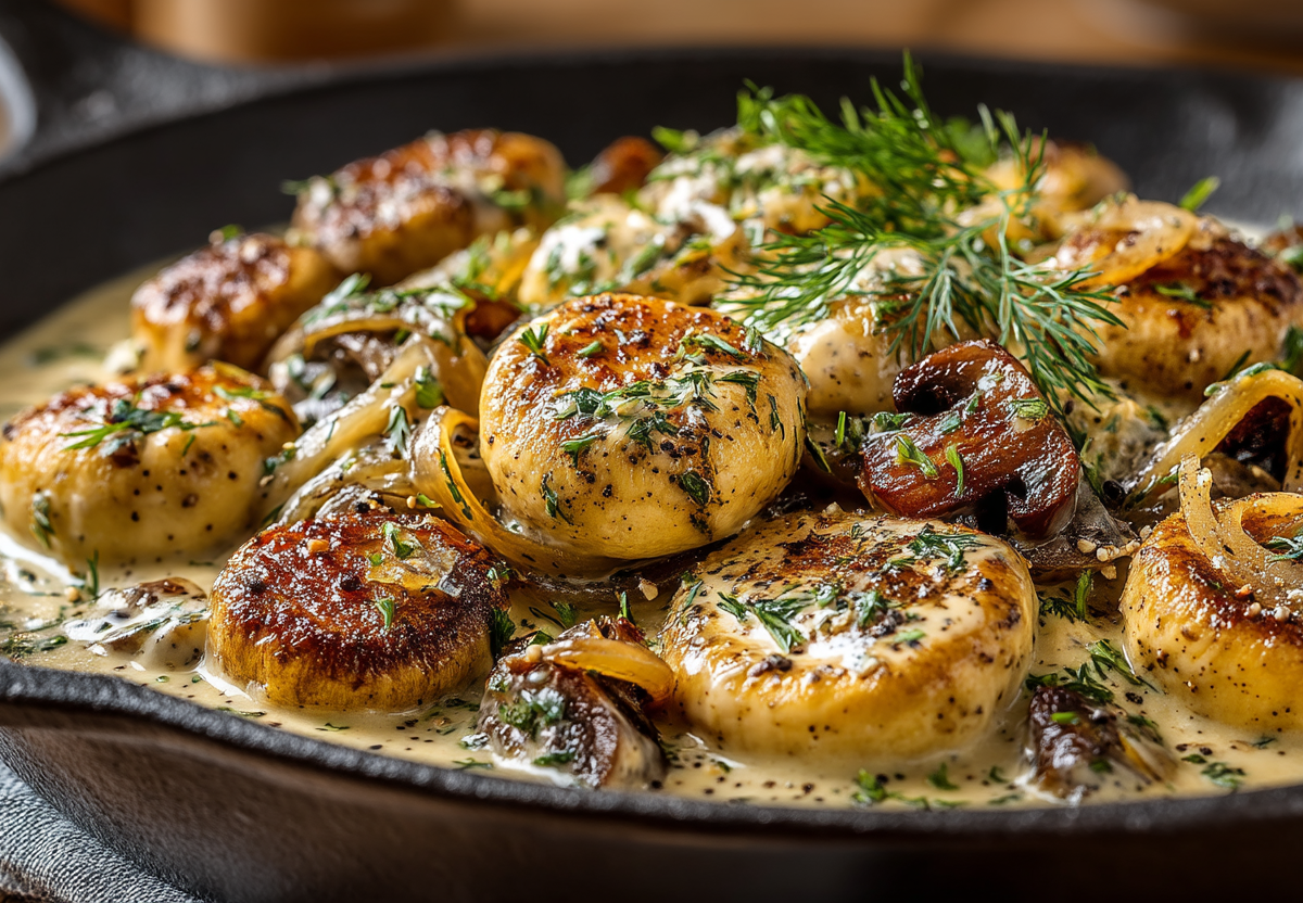 Это блюдо — настоящий хамелеон на вашей кухне. В один день эти нежные шампиньоны в бархатном сметанном соусе с ноткой муската могут выступить изысканным дополнением к сочному стейку. В другой — стать главным героем ужина в компании картофельного пюре или пасты.