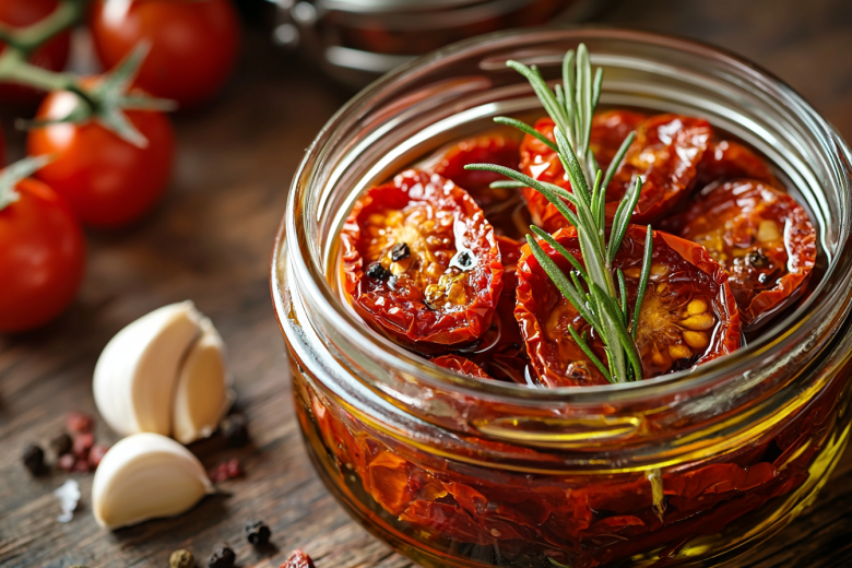 Для приготовления потребуется: 1 кг томатов сорта «сливка», 1 столовая ложка соли, 2 столовые ложки прованских трав, 1 столовая ложка сушеного базилика, растительное и оливковое масло для заливки, 3 зубчика чеснока, веточка розмарина. Томаты разрезают пополам, удаляют семена, посыпают солью и травами. Сушат в духовке с конвекцией при 130 градусах: сначала 2 часа, затем продавливают серединки и доводят до готовности еще около 1 часа. Готовые томаты укладывают в банки с чесноком и розмарином, заливают маслом. Ключевой секрет — контроль за процессом сушки, чтобы томаты сохранили эластичность и не пересушились.