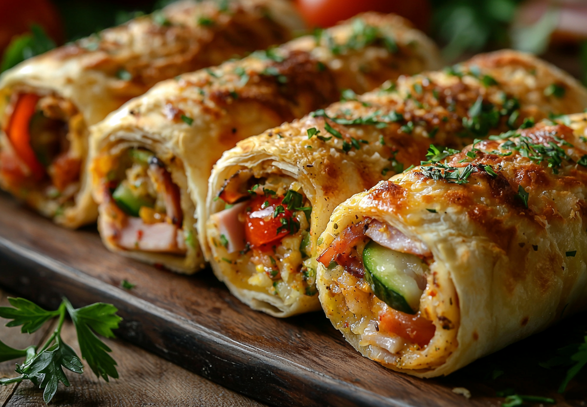 Все компоненты для начинки мелко режу: овощи - аккуратными кубиками, курицу и ветчину — соломкой, сыр тру на терке. Смешиваю с майонезом — получается сочная ароматная масса. Раскладываю лаваш, равномерно распределяю начинку и сворачиваю плотные трубочки. Смазываю взбитым яйцом для золотистой корочки и отправляю в разогретую до 170 °C духовку на 25 минут.