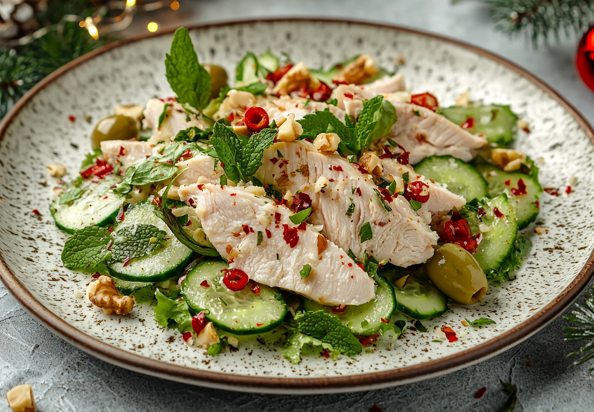 Ингредиенты: копченая куриная грудка (250 г), свежий огурец (1 крупный, ~200 г), мята свежая (10–15 г), грецкие орехи (50 г), острый перец чили (1/2 стручка), зеленые оливки без косточек (80 г), греческий йогурт (120 г), оливковое масло (1 ст. л.), лимон (1/2 шт.), соль — по вкусу.