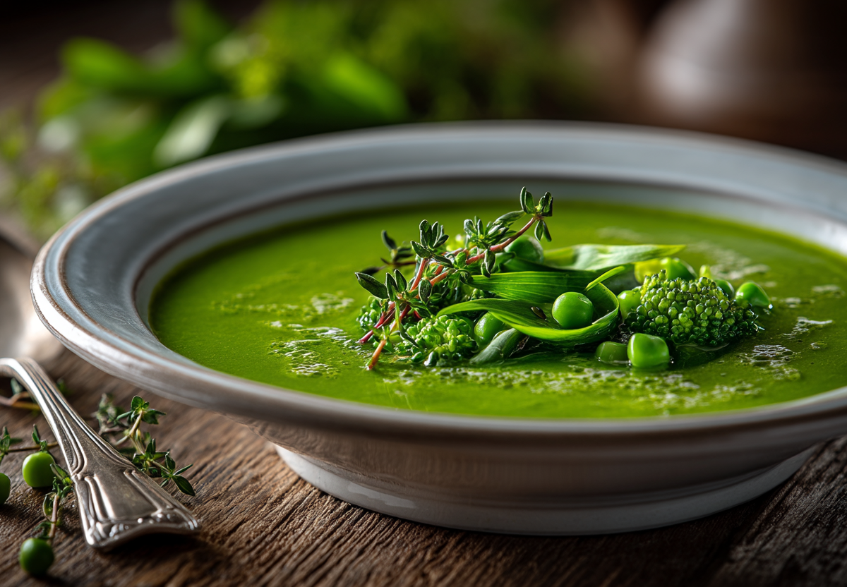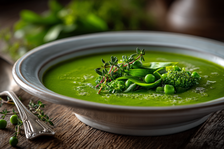 Этот рецепт кардинально меняет представление о гороховом супе. Без мяса и долгого ожидания — только свежие зеленые акценты, яркий цвет и легкий чесночный аромат молодой черемши, превращающие привычное блюдо в символ весны.