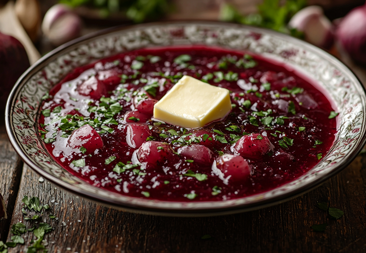Добавление небольшого кусочка сливочного масла (10–15 г на кастрюлю) в конце приготовления борща — кулинарный лайфхак, который кардинально меняет вкус блюда. Масло смягчает кислинку томатов и свеклы, придавая бульону бархатистую текстуру, а также «связывает» вкусы всех ингредиентов в гармоничную композицию.