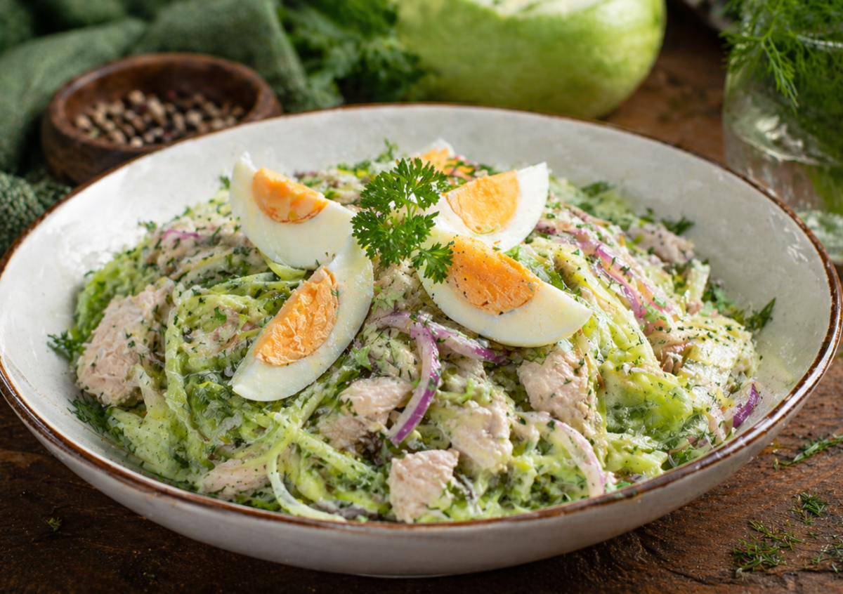 Иногда самые простые продукты дают лучший результат. Этот куриный салат — как раз такой случай: недорогая зеленая редька, немного курицы и легкая заправка — и получается полноценное блюдо, которое легко заменяет ужин.