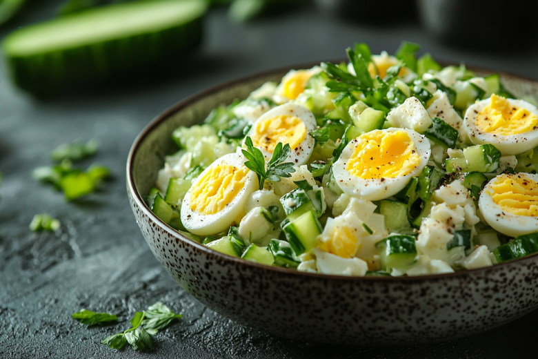 Начинаю с подготовки ингредиентов: яйца тщательно мою, кладу в холодную воду, довожу до кипения и варю 8–9 минут после закипания для состояния вкрутую. Заливаю готовые яйца ледяной водой на несколько минут — так они лучше чистятся. Зеленый лук промываю под проточной водой, обсушиваю бумажным полотенцем и мелко нарезаю острым ножом, используя как белую, так и зеленую части. Молодой сочный огурец мою, при желании очищаю от кожуры (хотя с ней салат получается более хрустящим) и нарезаю тонкой соломкой или полупрозрачными кружочками. Очищенные яйца либо мелко рублю ножом, либо натираю на крупной терке — в зависимости от желаемой текстуры. В просторной салатнице соединяю все подготовленные ингредиенты: зеленый лук, огурцы и яйца. Заправляю свежей прохладной сметаной, посыпаю солью и аккуратно, но тщательно перемешиваю. Даю салату постоять 2–3 минуты, чтобы вкусы соединились, и сразу подаю к столу. Идеально сочетается с отварным молодым картофелем, посыпанным укропом, или как легкий гарнир к мясу.