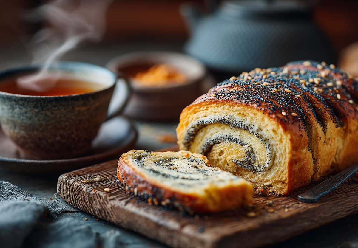 Аккуратно, но плотно сворачиваю рулет, защипываю края. Перекладываю рулет швом вниз на противень, застеленный пергаментом. Смазываю поверхность водой или молоком и посыпаю отложенным маком. Выпекаю в разогретой до 180°C духовке 40–50 минут до красивого золотистого цвета. Готовому рулету даю постоять на противне 15–20 минут, после чего нарезаю теплым на порционные ломтики.