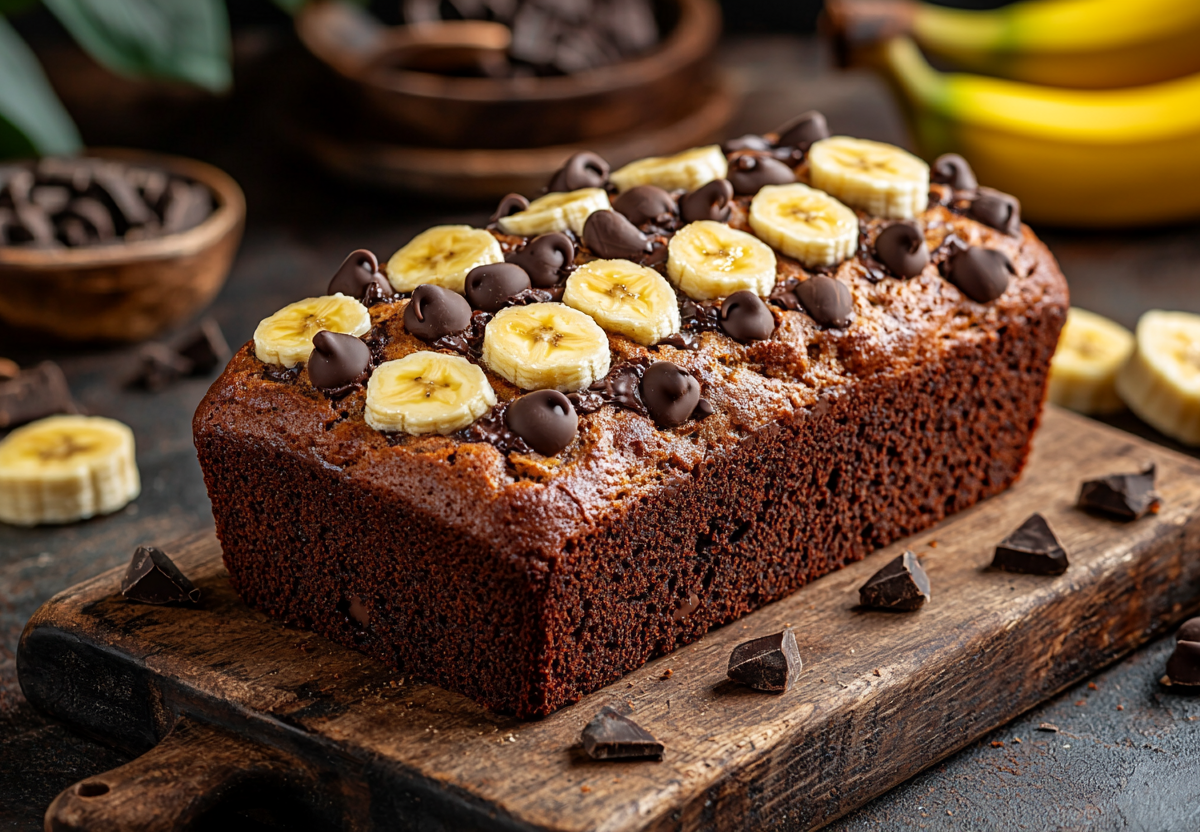 Готовлю так: разминаю три банана вилкой в пюре, добавляю два яйца, мягкое сливочное масло (80 г), сахар (50 г), ванильный сахар (1 ч. л.), соль (0,5 ч. л.) и корицу (2 ч. л.). Взбиваю миксером около трех минут до однородности. Просеиваю муку (160 г) с разрыхлителем (10 г), аккуратно перемешиваю. Добавляю крупно нарезанный горький шоколад (70 г). Тесто выкладываю в форму, застеленную пергаментом, сверху украшаю половинками четвертого банана. Выпекаю при 170°C 45–50 минут. Проверяю зубочисткой — если она сухая, хлеб готов. Даю полностью остыть перед нарезкой.