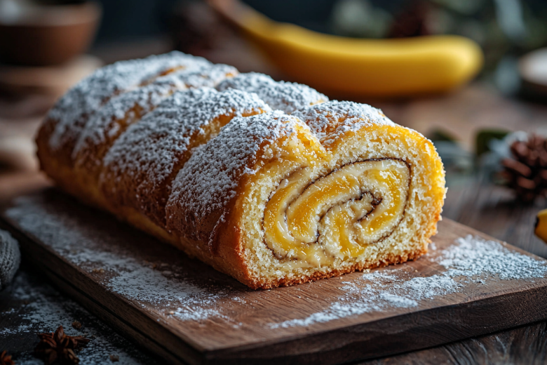Тесто выливаю на противень, застеленный пергаментом, и разравниваю тонким слоем. Выпекаю в разогретой до 180 °C духовке 5–7 минут до легкого румянца. Горячий корж сразу смазываю банкой вареной сгущенки, выкладываю 1–2 очищенных банана и быстро сворачиваю в рулет с помощью пергамента. Сверху посыпаю сахарной пудрой.