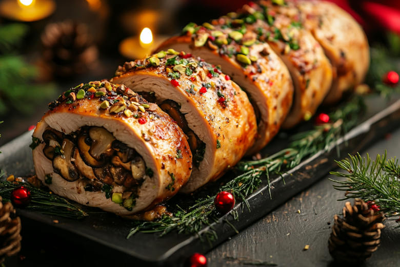 Этот рулет — не просто закуска, а настоящее украшение стола. Нежное куриное мясо, ароматные грибы и хрустящие фисташки в аккуратной нарезке выглядят по-праздничному эффектно и исчезают со стола первыми.