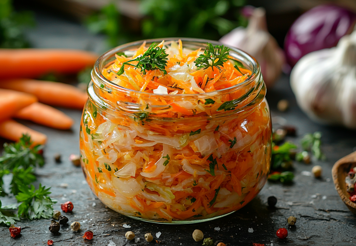 Рецепт: натрите 1 кг моркови и 500 г белокочанной капусты специальной теркой для корейских салатов. Добавьте 2 измельченных зубчика чеснока, 1 ст. л. молотого кориандра, 1 ч. л. красного перца и 1 нарезанную луковицу. Приготовьте маринад: вскипятите 200 мл воды с 50 мл уксуса 9%, 2 ст. л. сахара, 1 ст. л. соли и 50 мл растительного масла. Горячим маринадом залейте овощи, плотно уложите в стерильные банки, закатайте.